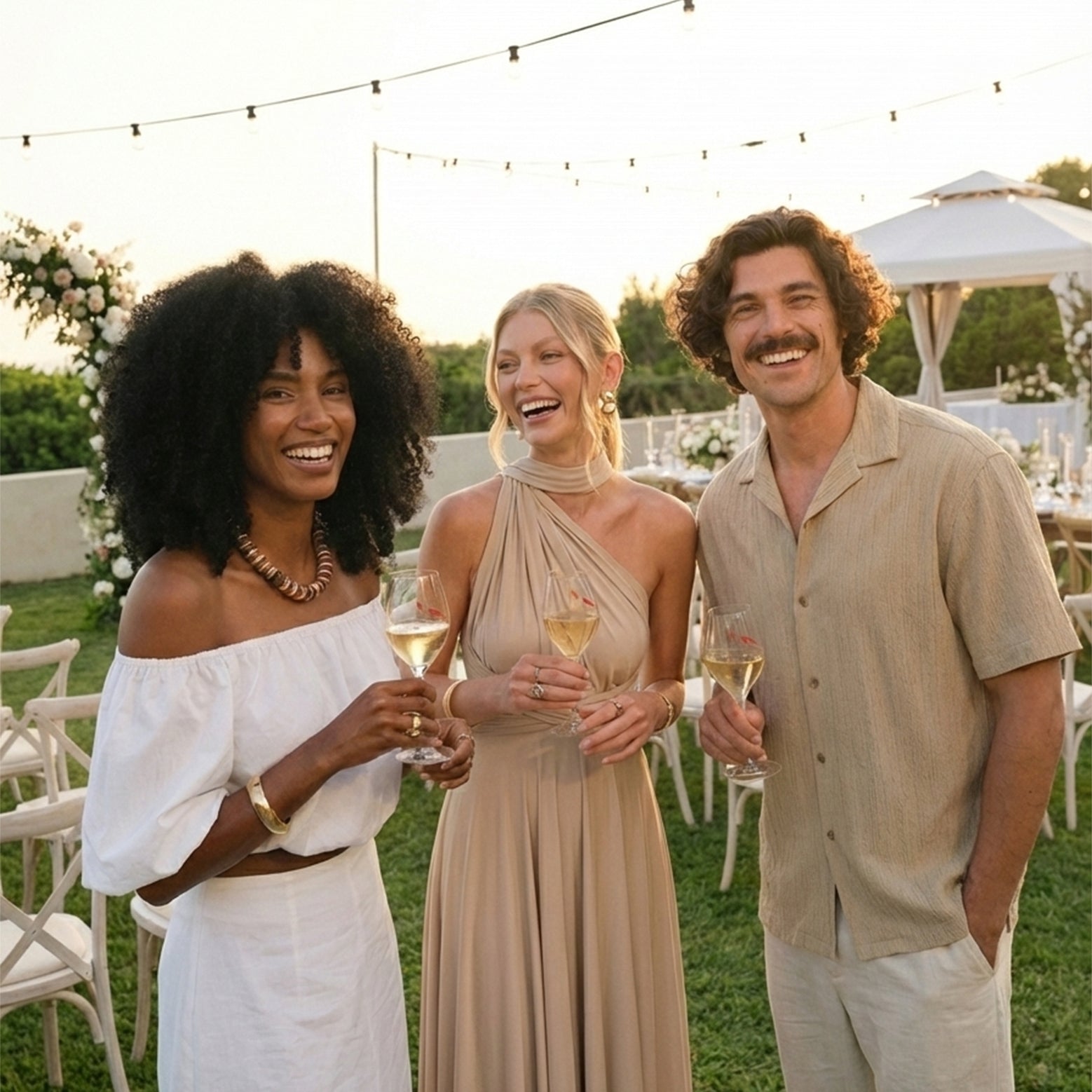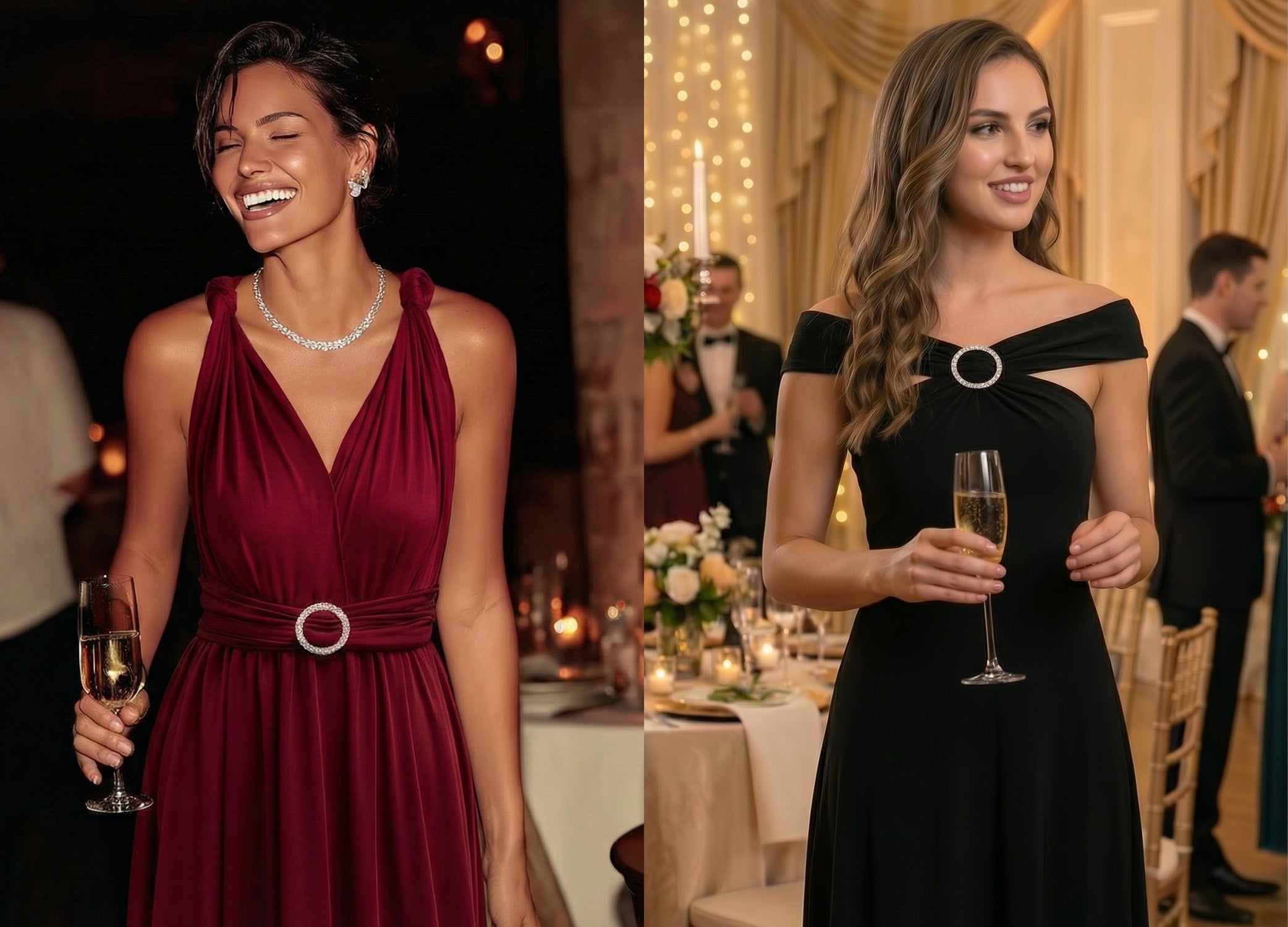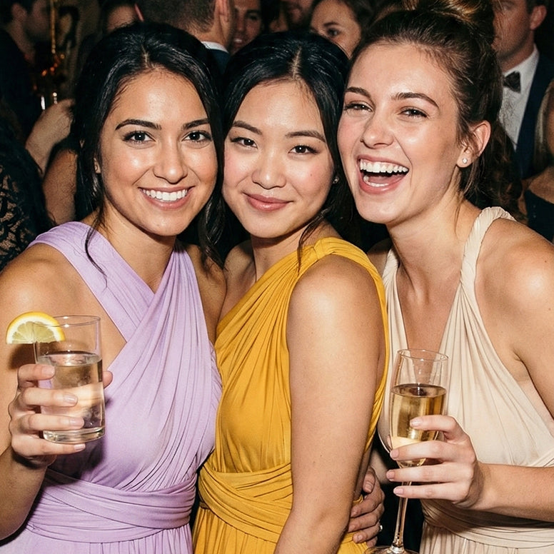 One dress, endless evening moments. Gown-level drape meets convertible versatility — from wedding aisles to gala nights.